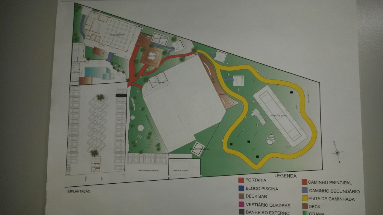 O projeto estará contemplando: Portaria, Estacionamento, Sauna com ofurô, Sala de jogos, Sala de tv, Play ground, Vestiário para piscina, Vestiário para campo de futebol e quadra tênis, Campo de bocha, Bar, Cozinha industrial, Quiosques, Pista para caminhada e ciclismo, Revitalização do Bosque, Projeto paisagístico, etc..."